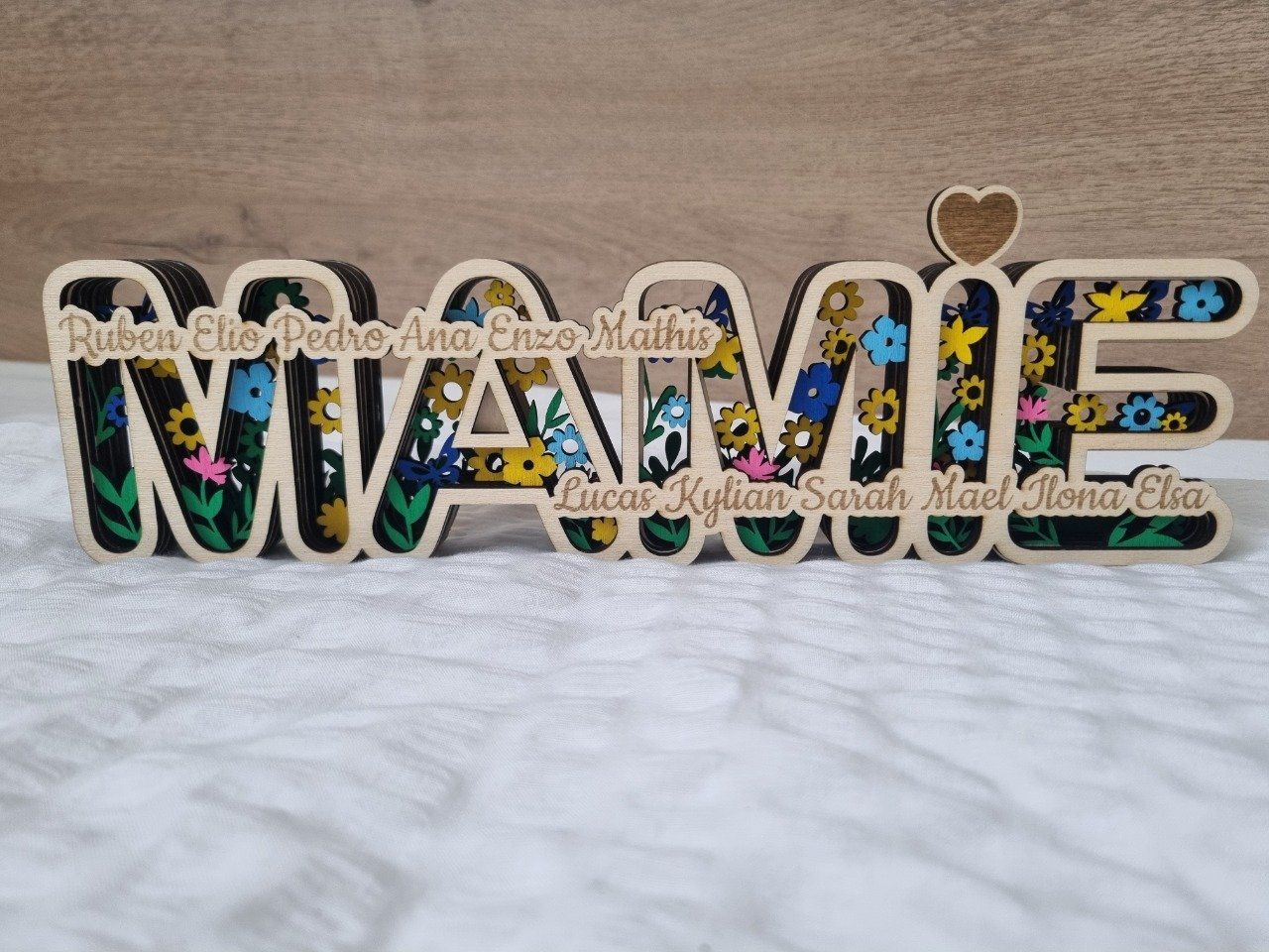 Magnifique mot " Mamie" decoupé et gravé au laser en 7 épaisseurs de 3 mm , collés ensemble pour donner un joli effet relief.